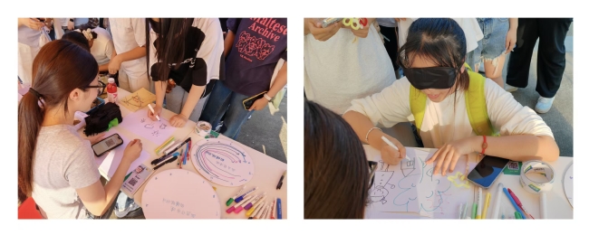 这一沉浸式环节要求参与者闭眼听令作画:从太阳轮廓到房屋门窗,再到树木枝丫与人物笑脸,全程抛开视觉依赖。趣味创作让学业压力暂时“退场”,在专注中实现身心双重放松。